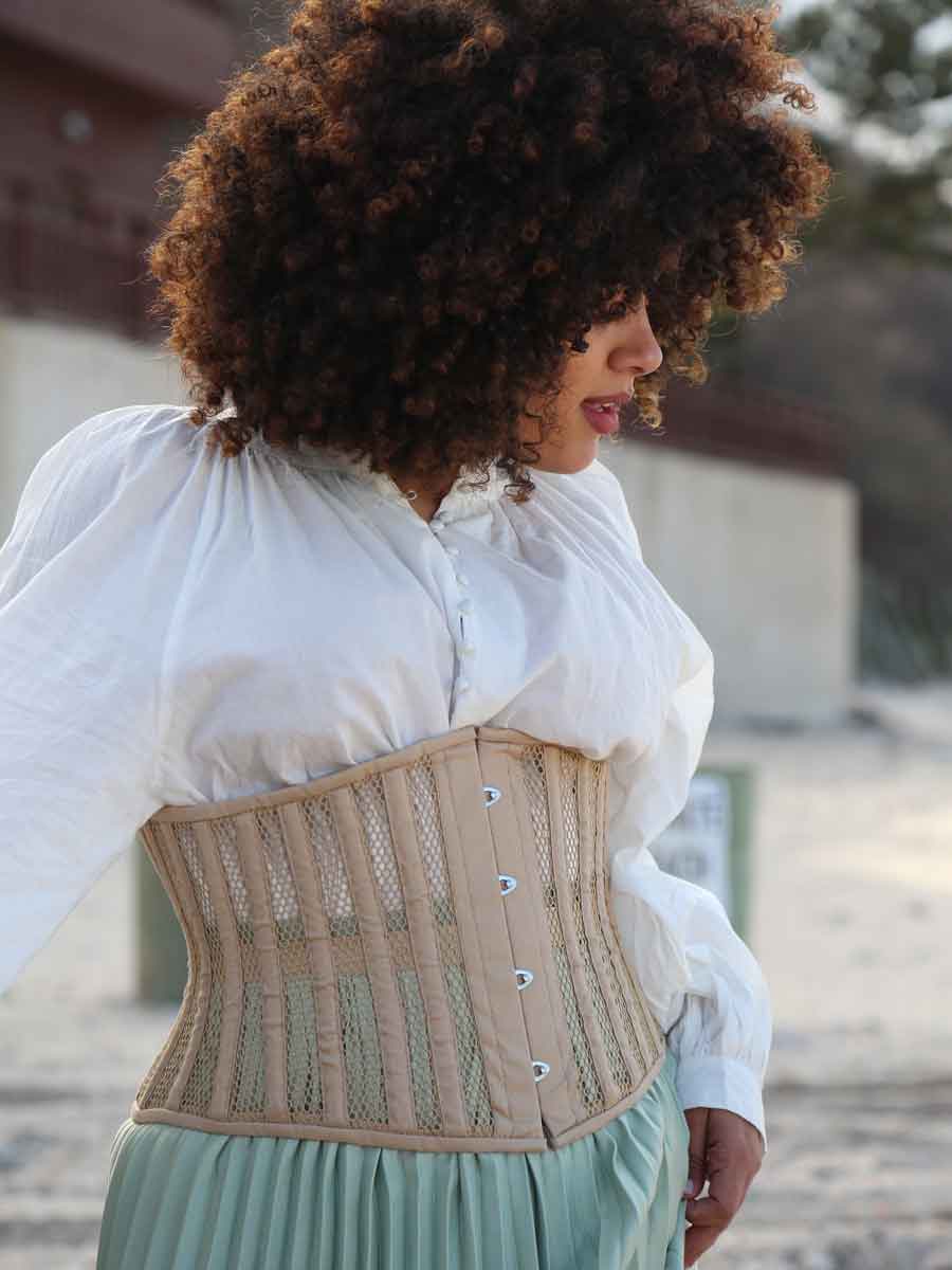 This corset features a romantic curve silhouette with a rigid split front steel busk for secure closure. The durable polyester blend mesh pairs with 100% cotton trim and a cotton modesty panel for all-day wearability. Pre-laced bidirectionally and available in closed waist sizes 18–40 inches, it's designed for average torso length with 6" rib and 10" hip springs.