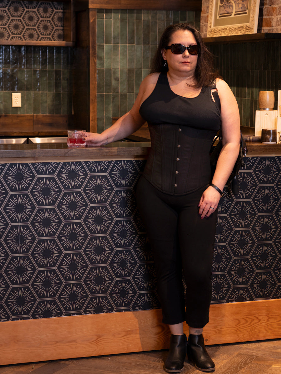 This sleek black cotton corset is built to last and specially designed to flatter V-shaped figures with its signature Modern Curve. The CS-701 features a wider ribcage and slimmer hips, in contrast to our other styles. This narrow hip shape is perfect for male physiques and suits women with longer torsos and narrow hips seeking an elegant fit.